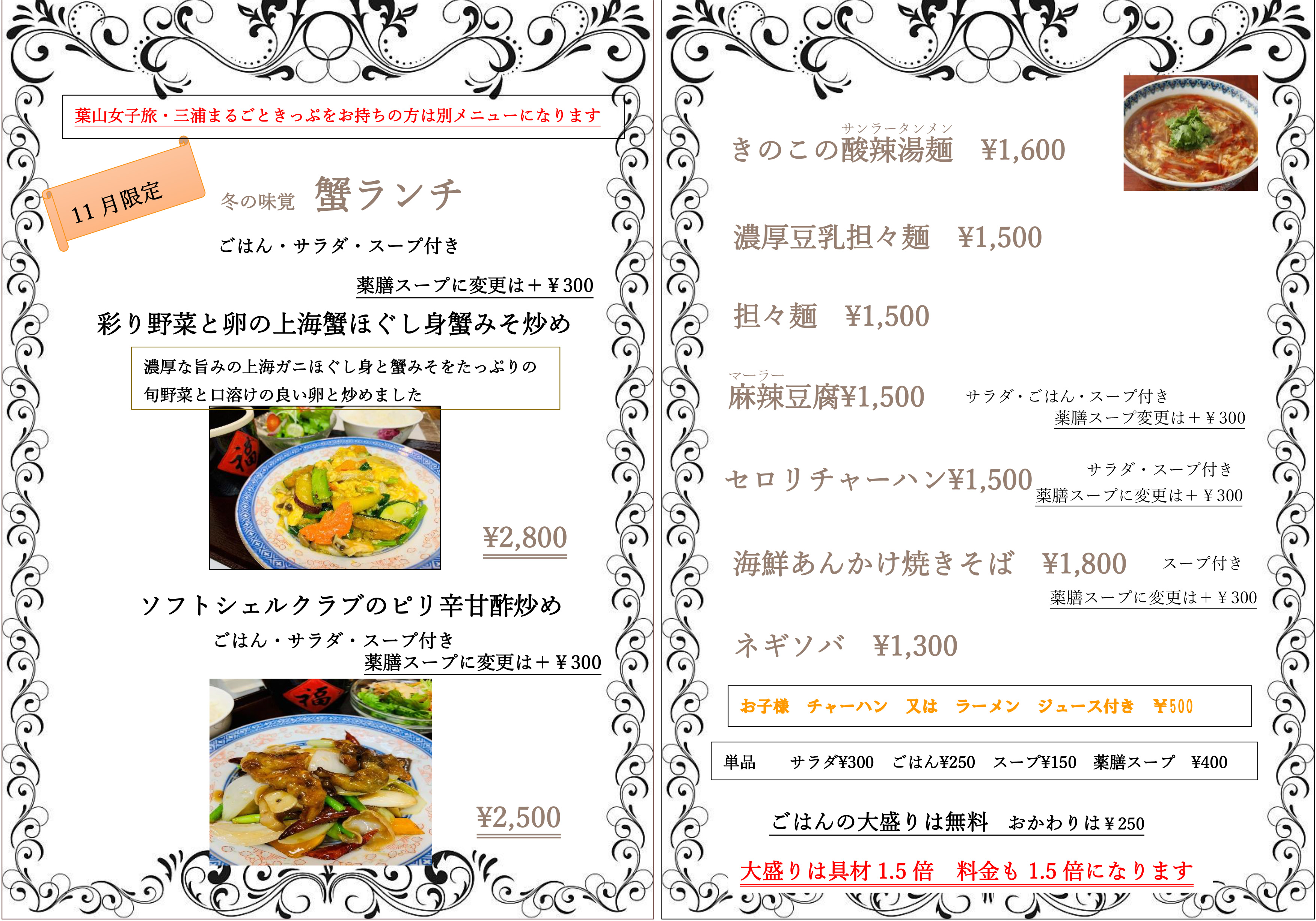 当店の11月のランチは「葉山女子旅きっぷランチ&蟹ランチ」です。