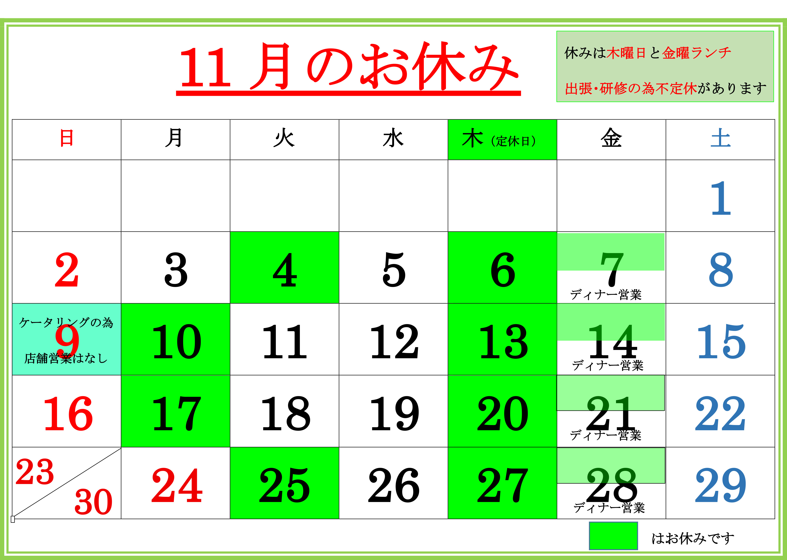 ※11月9日(日)はケータリングの為、店舗営業はなし。