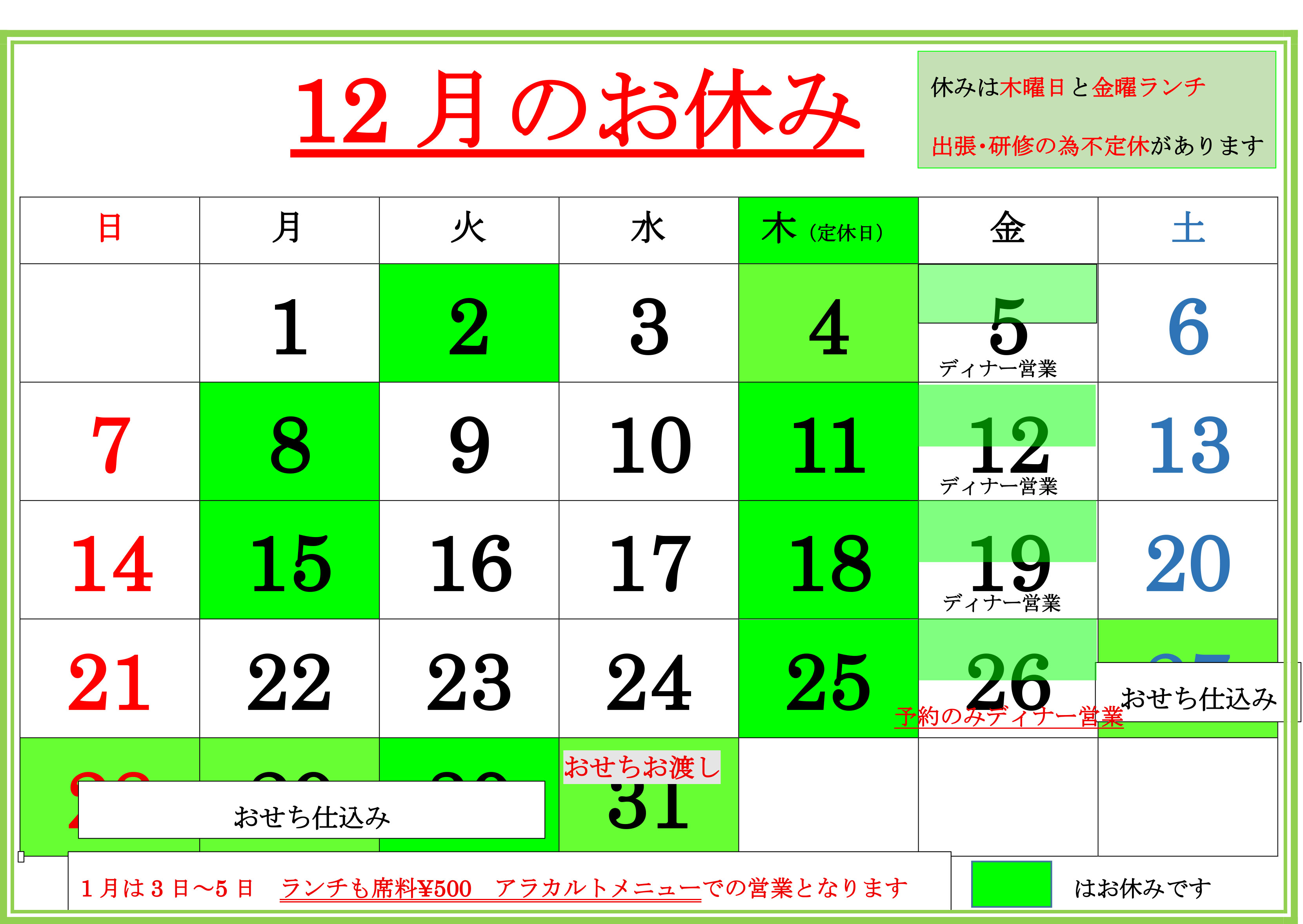 ※年明けは3日~5日ランチも席料500円、アラカルト営業となります。