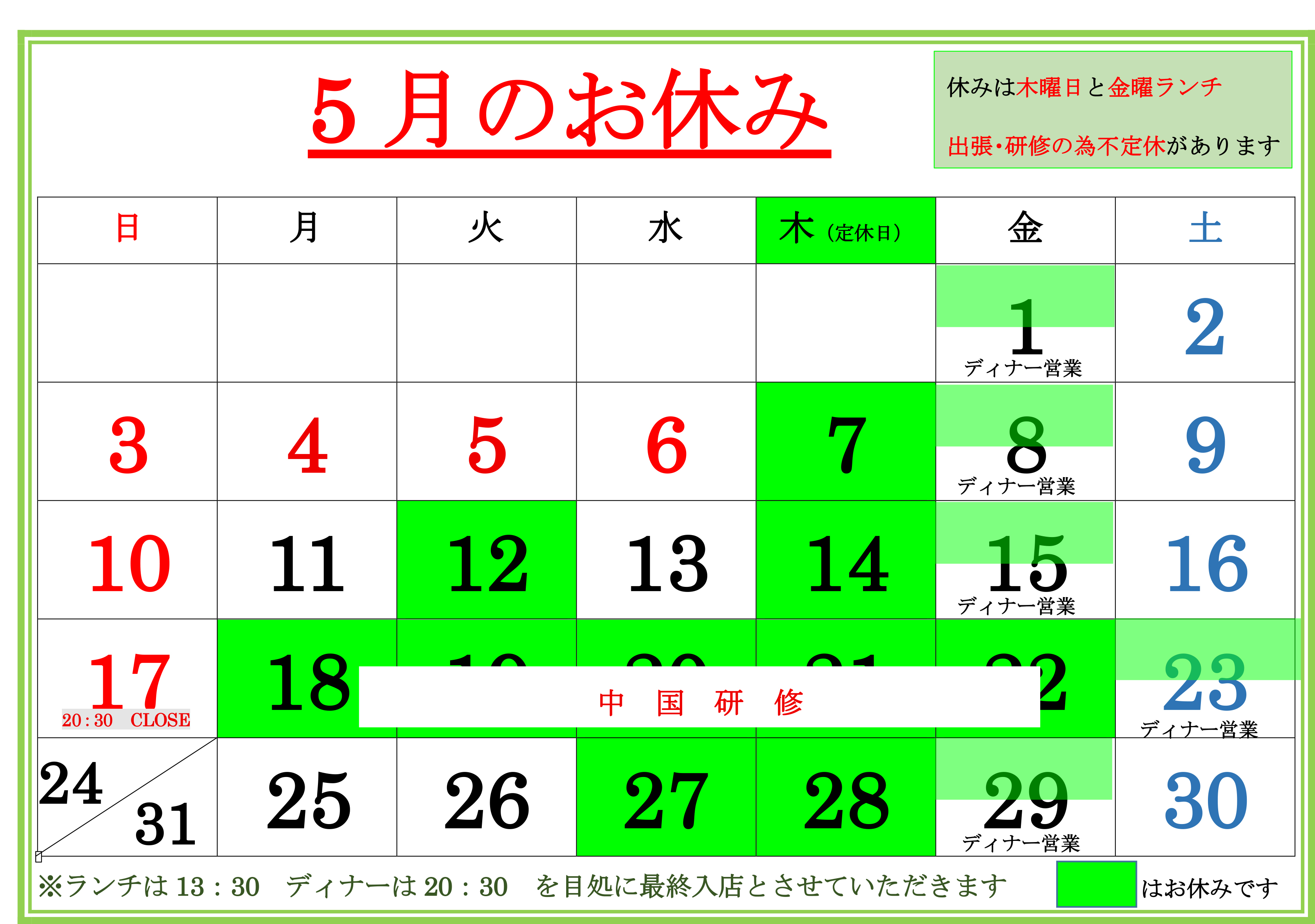 5月お休みのお知らせ