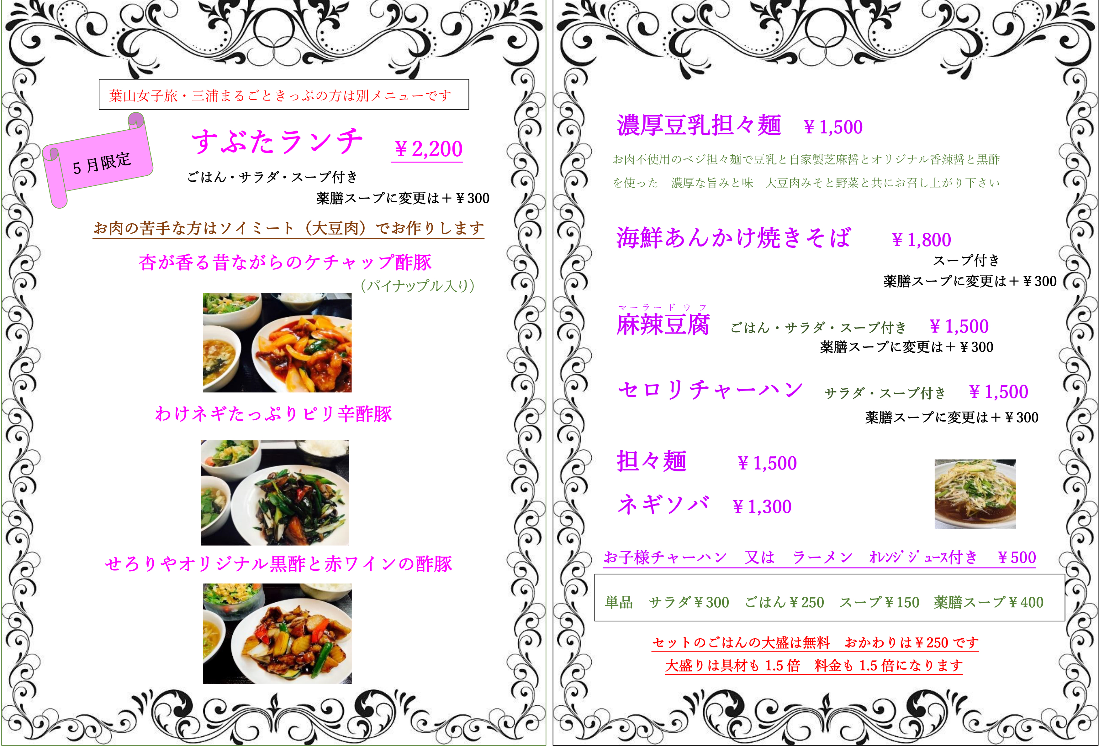 5月のランチメニュー 2026年4月27日月のランチメニューseloriya Tweet 5月になり、気温もますます上がっていきますね☀ そんな5月のランチは「野菜いっぱいすぶた」です。 ぜひご賞味くださいませ! 当店では空調設備の清掃完了と HEPAフィルター搭載の空気清浄機を設置いたしました。 快適なお食事サポートいたします。